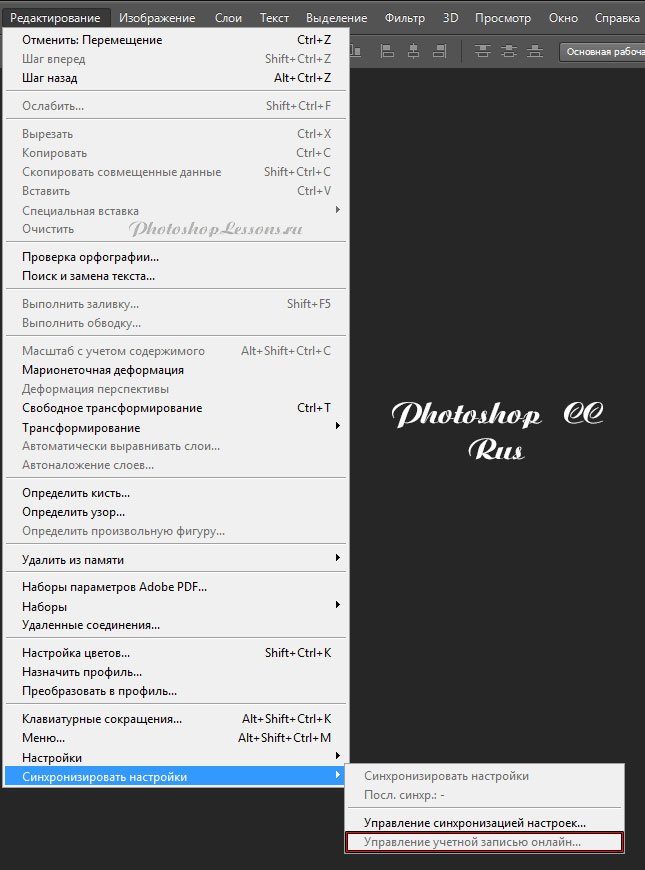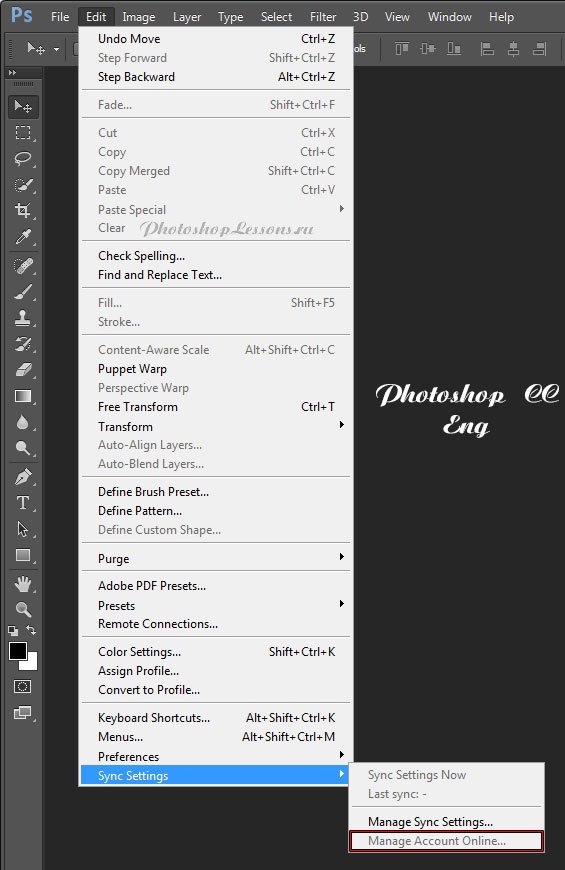 | Edit - Sync Settings - Manage Account Online (Ред. - Синхр. настройки - Управление учетной записью)Перевод Edit - Sync Settings - Manage Account Online (Ред. - Синхр. настройки - Управление учетной записью онлайн) на примере Photoshop CC (Eng/Rus). На изображениях ниже вы можете наглядно увидеть месторасположение и перевод термина Edit - Sync Settings - Manage Account Online (Редактирование - Синхронизировать настройки - Управление учетной записью онлайн) на примере Английской и Русской версии Photoshop CC (2014). ![]() ![]() |