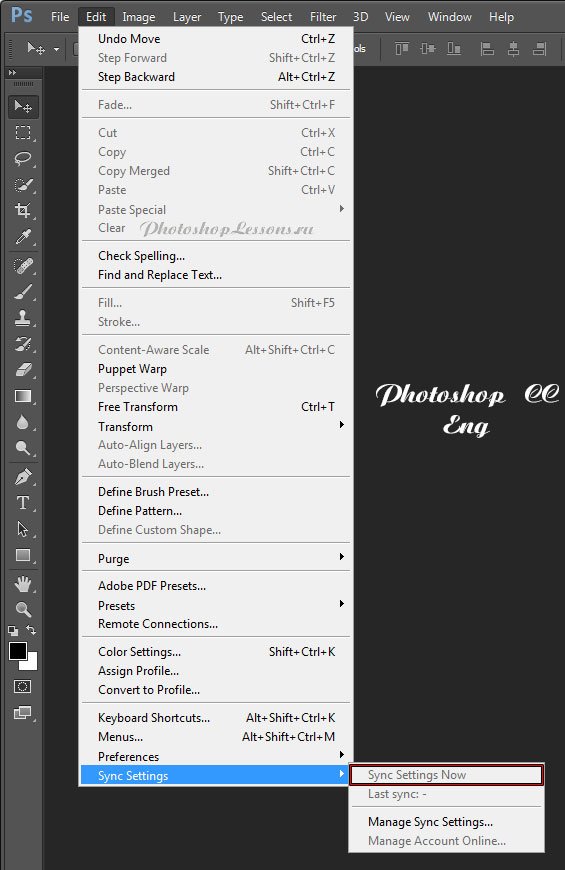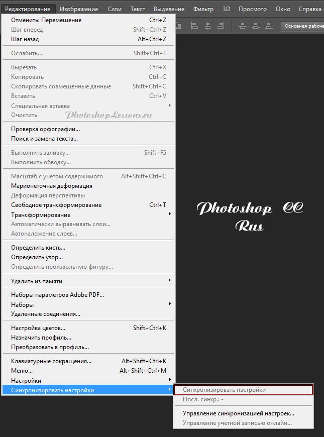 | Edit - Sync Settings - Sync Settings New (Ред. - Синхронизировать настройки - Синхронизировать)Перевод Edit - Sync Settings - Sync Settings New (Ред. - Синхронизировать настройки - Синхронизировать) на примере Photoshop CC (Eng/Rus). На изображениях ниже вы можете наглядно увидеть месторасположение и перевод термина Edit - Sync Settings - Sync Settings New (Редактирование - Синхронизировать настройки - Синхронизировать настройки) на примере Английской и Русской версии Photoshop CC (2014). ![]() ![]() |