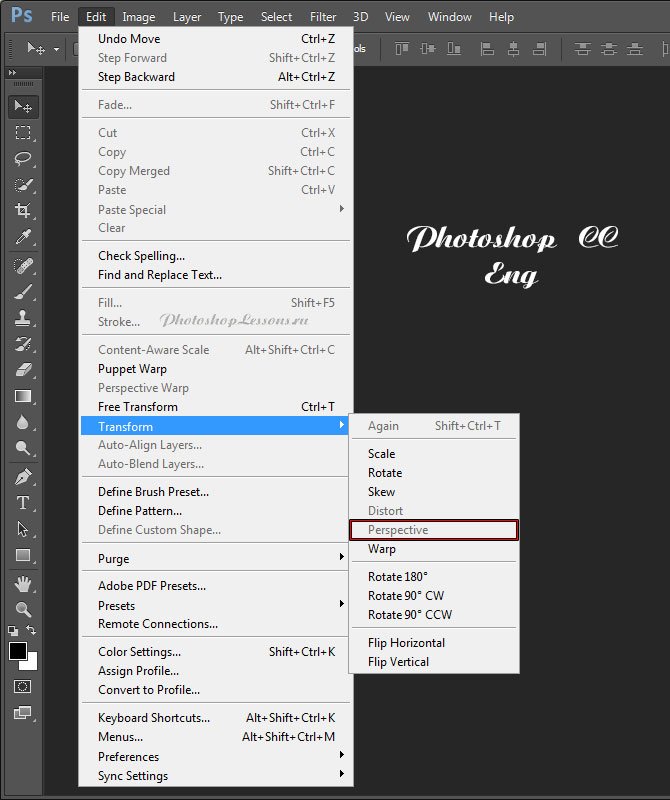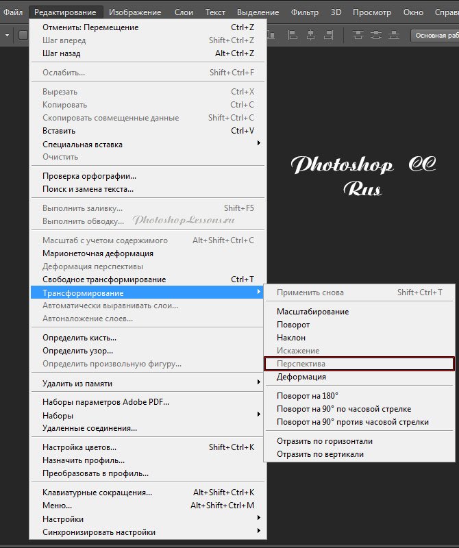 | Перевод Edit - Transform - Perspective (Редактирование - Трансформирование - Перспектива)Перевод и месторасположение Edit - Transform - Perspective (Редактирование - Трансформирование - Перспектива) на примере Photoshop CC (Eng/Rus). На изображениях ниже вы можете наглядно увидеть месторасположение и перевод термина Edit - Transform - Perspective (Редактирование - Трансформирование - Перспектива) на примере Английской и Русской версии Photoshop CC (2014). ![]() ![]() |