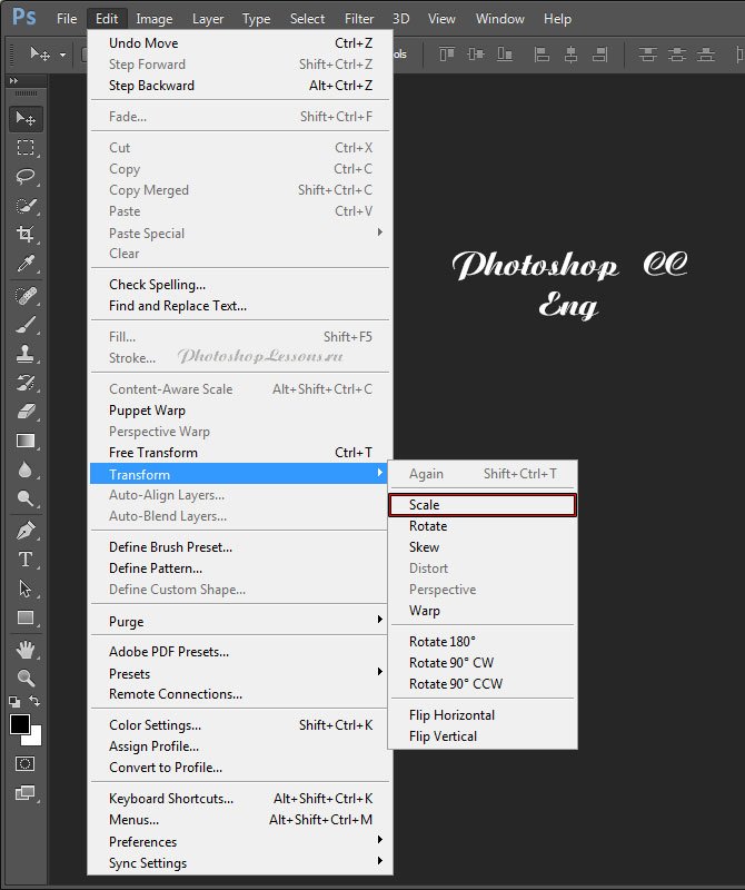 | Перевод Edit - Transform - Scale (Редактирование - Трансформирование - Масштабирование)Перевод и месторасположение Edit - Transform - Scale (Редактирование - Трансформирование - Масштабирование) на примере Photoshop CC (Eng/Rus). На изображениях ниже вы можете наглядно увидеть месторасположение и перевод термина Edit - Transform - Scale (Редактирование - Трансформирование - Масштабирование) на примере Английской и Русской версии Photoshop CC (2014). ![]() ![]() |