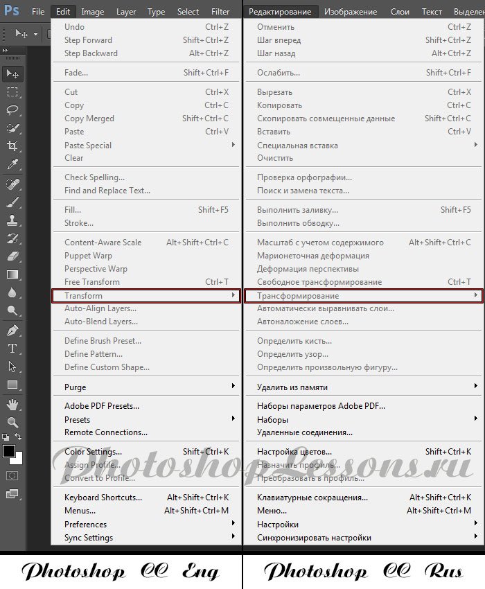| Перевод Edit - Transform (Редактирование - Трансформирование)Перевод и месторасположение Edit - Transform (Редактирование - Трансформирование) на примере Photoshop CC (Eng/Rus). На изображении ниже вы можете наглядно увидеть месторасположение и перевод термина Edit - Transform (Редактирование - Трансформирование) на примере Английской и Русской версии Photoshop CC (2014). ![]() |