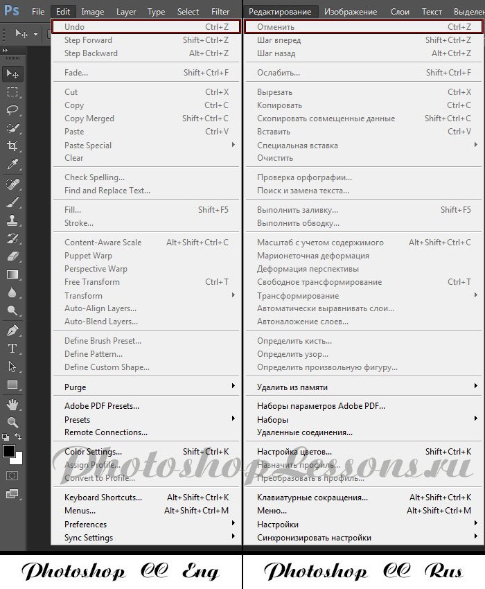 | Перевод Edit - Undo (Редактирование - Отменить / Ctrl+Z)Перевод и месторасположение Edit - Undo (Редактирование - Отменить) на примере Photoshop CC (Eng/Rus). На изображении ниже вы можете наглядно увидеть месторасположение и перевод термина Edit - Undo (Редактирование - Отменить / Сочетание клавиш «Ctrl+Z») на примере Английской и Русской версии Photoshop CC (2014). ![]() |