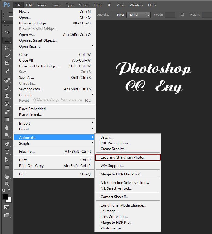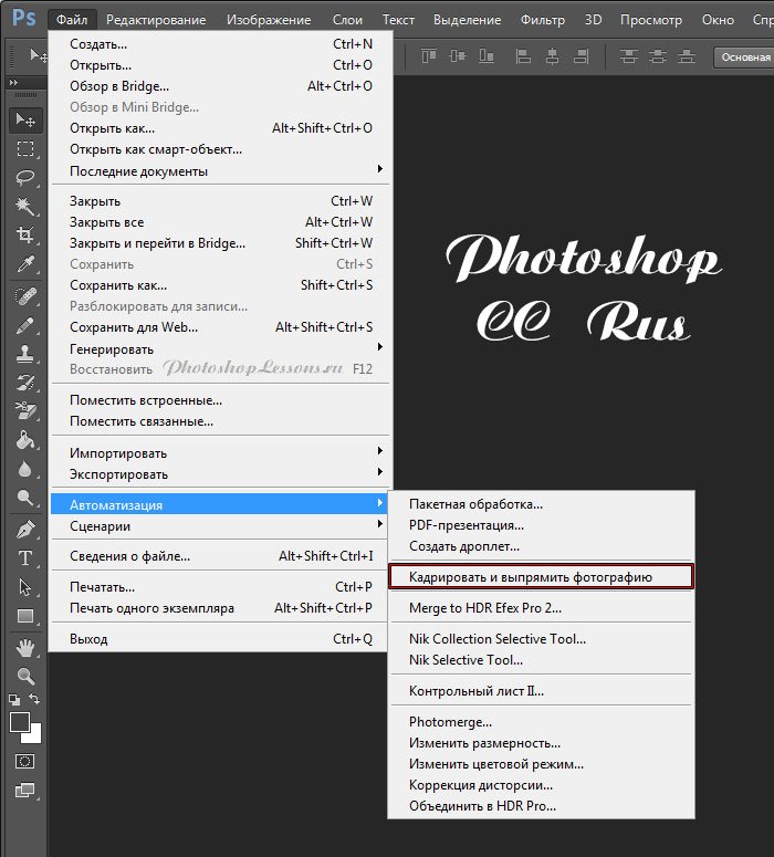 | File - Automate - Crop and Straighten Photos (Файл - Автоматизация - Кадрировать и выпрямить фото)Перевод File - Automate - Crop and Straighten Photos (Файл - Автоматизация - Кадрировать и выпрямить фотографию) на примере Photoshop CC (Rus/Eng). На изображениях ниже вы можете наглядно увидеть месторасположение и перевод термина File - Automate - Crop and Straighten Photos (Файл - Автоматизация - Кадрировать и выпрямить фотографию) на примере Русской и Английской версии Photoshop CC (2014). ![]() ![]() |