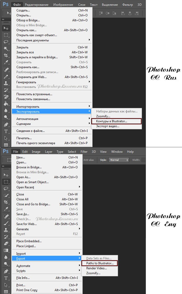 | Перевод File - Export - Paths to Illustrator (Файл - Экспортировать - Контуры в Illustrator)Перевод и месторасположение File - Export - Paths to Illustrator (Файл - Экспортировать - Контуры в Illustrator) на примере Photoshop CC (Rus/Eng). На изображении ниже вы можете наглядно увидеть месторасположение и перевод термина File - Export - Paths to Illustrator (Файл - Экспортировать - Контуры в Illustrator) на примере Русской и Английской версии Photoshop CC (2014). ![]() |