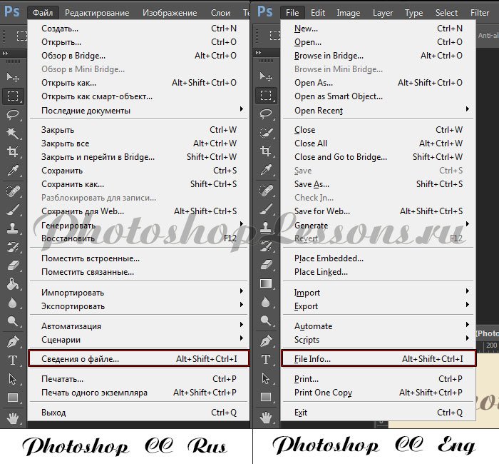 | Перевод File - File Info (Файл - Сведения о файле / Alt+Shift+Ctrl+I)Перевод и месторасположение File - File Info (Файл - Сведения о файле) на примере Photoshop CC (Rus/Eng). На изображении ниже вы можете наглядно увидеть месторасположение и перевод термина File - File Info (Файл - Сведения о файле / Сочетание клавиш «Alt+Shift+Ctrl+I») на примере Русской и Английской версии Photoshop CC (2014). ![]() |