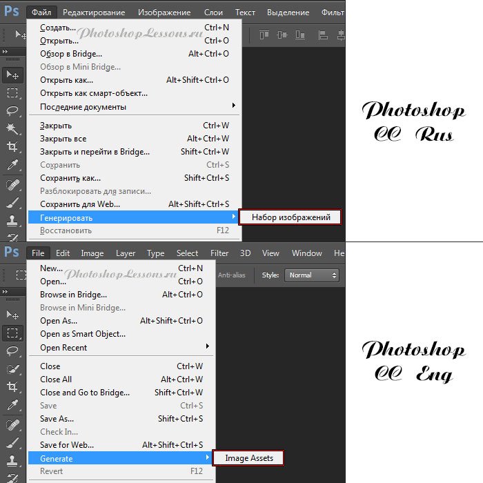 | Перевод File - Generate - Image Assets (Файл - Генерировать - Набор изображений)Перевод и месторасположение File - Generate - Image Assets (Файл - Генерировать - Набор изображений) на примере Photoshop CC (Rus/Eng). На изображении ниже вы можете наглядно увидеть месторасположение и перевод термина File - Generate - Image Assets (Файл - Генерировать - Набор изображений) на примере Русской и Английской версии Photoshop CC (2014). ![]() |