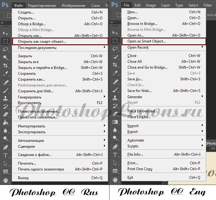 | Перевод File - Open as Smart Object (Файл - Открыть как смарт-объект)Перевод и месторасположение File - Open as Smart Object (Файл - Открыть как смарт-объект) на примере Photoshop CC (Rus/Eng). На изображении ниже вы можете наглядно увидеть месторасположение и перевод термина File - Open as Smart Object (Файл - Открыть как смарт-объект) на примере Русской и Английской версии Photoshop CC (2014). ![]() |