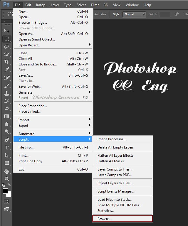 | Перевод File - Scripts - Browse (Файл - Сценарии - Обзор)Перевод и месторасположение File - Scripts - Browse (Файл - Сценарии - Обзор) на примере Photoshop CC (Rus/Eng). На изображениях ниже вы можете наглядно увидеть месторасположение и перевод термина File - Scripts - Browse (Файл - Сценарии - Обзор) на примере Русской и Английской версии Photoshop CC (2014). ![]() ![]() |