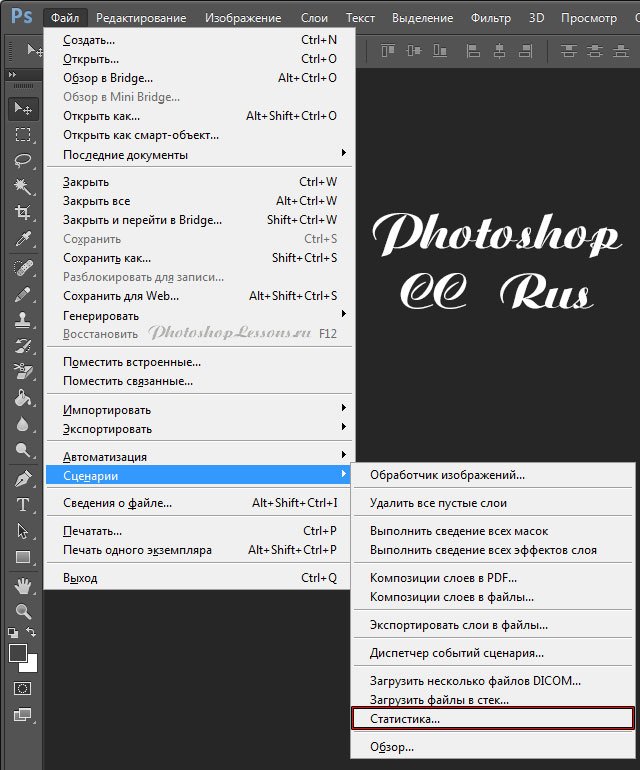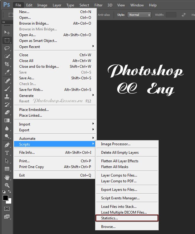 | Перевод File - Scripts - Statisics (Файл - Сценарии - Статистика)Перевод и месторасположение File - Scripts - Statisics (Файл - Сценарии - Статистика) на примере Photoshop CC (Rus/Eng). На изображениях ниже вы можете наглядно увидеть месторасположение и перевод термина File - Scripts - Statisics (Файл - Сценарии - Статистика) на примере Русской и Английской версии Photoshop CC (2014). ![]() ![]() |