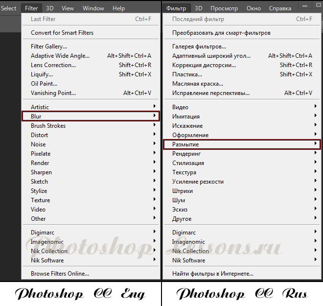 | Перевод Filter - Blur (Фильтр - Размытие)Перевод и месторасположение Filter - Blur (Фильтр - Размытие) на примере Photoshop CC (Eng/Rus). На изображении ниже вы можете наглядно увидеть месторасположение и перевод термина Filter - Blur (Фильтр - Размытие) на примере Английской и Русской версии Photoshop CC (2014). ![]() |