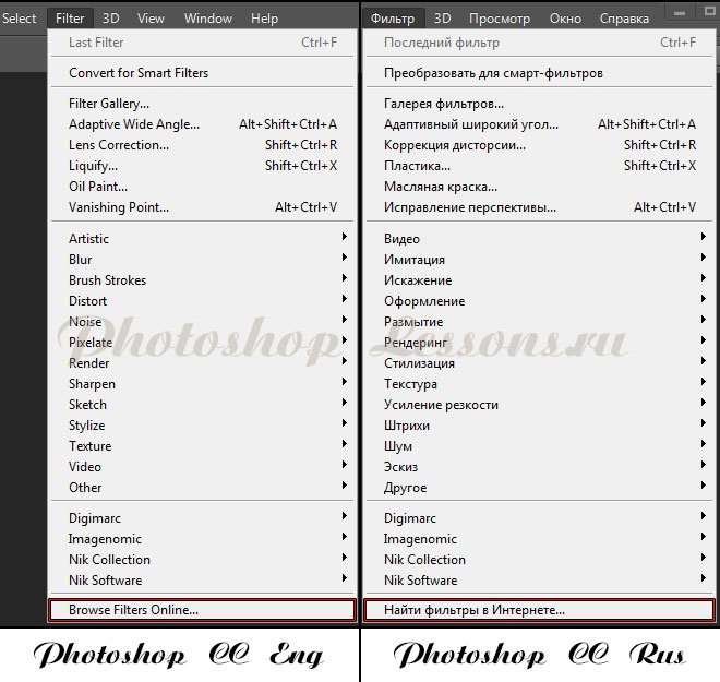 | Перевод Filter - Browse Filters Online (Фильтр - Найти фильтры в Интернете)Перевод и месторасположение Filter - Browse Filters Online (Фильтр - Найти фильтры в Интернете) на примере Photoshop CC (Eng/Rus). На изображении ниже вы можете наглядно увидеть месторасположение и перевод термина Filter - Browse Filters Online (Фильтр - Найти фильтры в Интернете) на примере Английской и Русской версии Photoshop CC (2014). ![]() |