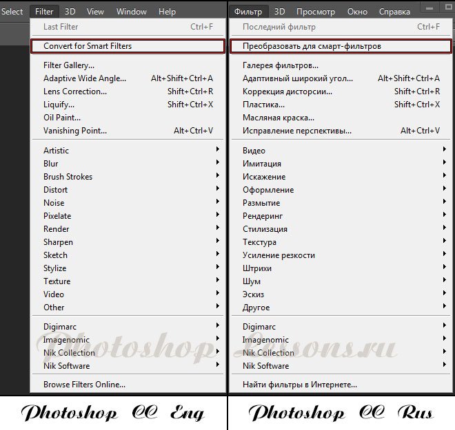 | Перевод Filter - Convert for Smart Filters (Фильтр - Преобразовать для смарт-фильтров)Перевод и месторасположение Filter - Convert for Smart Filters (Фильтр - Преобразовать для смарт-фильтров) на примере Photoshop CC (Eng/Rus). На изображении ниже вы можете наглядно увидеть месторасположение и перевод термина Filter - Convert for Smart Filters (Фильтр - Преобразовать для смарт-фильтров) на примере Английской и Русской версии Photoshop CC (2014). ![]() |