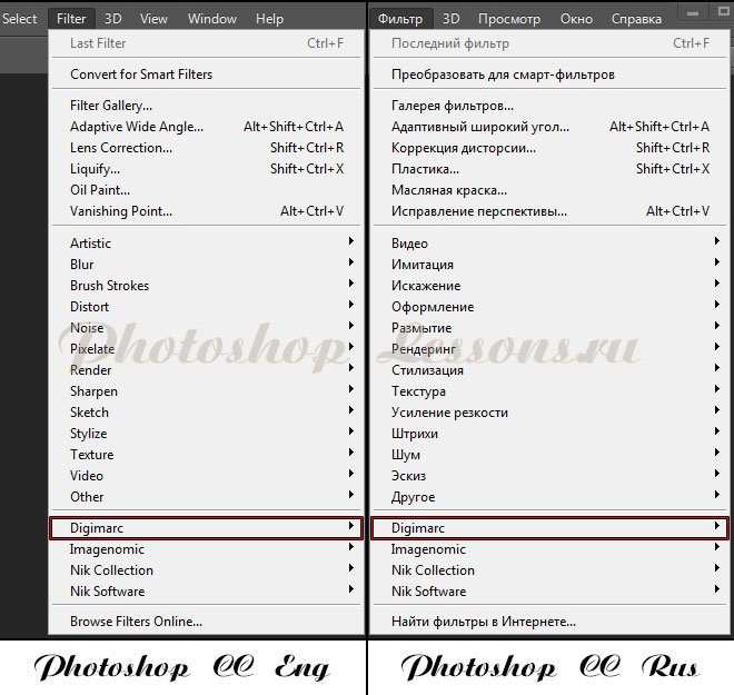 | Перевод Filter - Digimarc (Фильтр - Digimarc)Перевод и месторасположение Filter - Digimarc (Фильтр - Digimarc) на примере Photoshop CC (Eng/Rus). На изображении ниже вы можете наглядно увидеть месторасположение и перевод термина Filter - Digimarc (Фильтр - Digimarc) на примере Английской и Русской версии Photoshop CC (2014). ![]() |