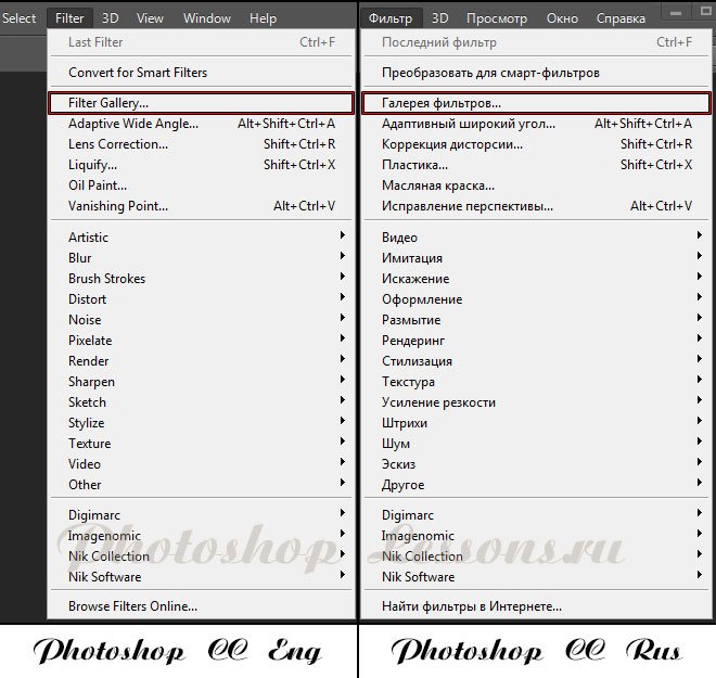 | Перевод Filter - Filter Gallery (Фильтр - Галерея фильтров)Перевод и месторасположение Filter - Filter Gallery (Фильтр - Галерея фильтров) на примере Photoshop CC (Eng/Rus). На изображении ниже вы можете наглядно увидеть месторасположение и перевод термина Filter - Filter Gallery (Фильтр - Галерея фильтров) на примере Английской и Русской версии Photoshop CC (2014). ![]() |