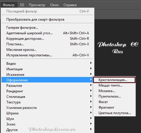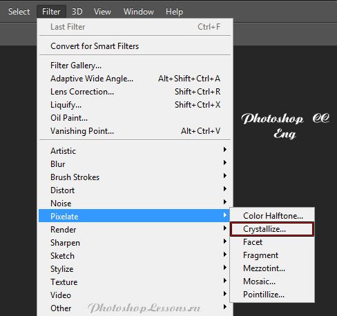 | Перевод Filter - Pixelate - Crystallize (Фильтр - Оформление - Кристаллизация)Перевод и месторасположение Filter - Pixelate - Crystallize (Фильтр - Оформление - Кристаллизация) на примере Photoshop CC (Eng/Rus). На изображениях ниже вы можете наглядно увидеть месторасположение и перевод термина Filter - Pixelate - Crystallize (Фильтр - Оформление - Кристаллизация) на примере Английской и Русской версии Photoshop CC (2014). |