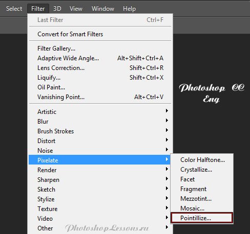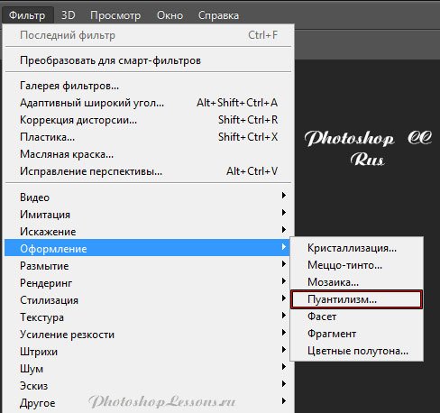 | Перевод Filter - Pixelate - Pointillize (Фильтр - Оформление - Пуантилизм)Перевод и месторасположение Filter - Pixelate - Pointillize (Фильтр - Оформление - Пуантилизм) на примере Photoshop CC (Eng/Rus). На изображениях ниже вы можете наглядно увидеть месторасположение и перевод термина Filter - Pixelate - Pointillize (Фильтр - Оформление - Пуантилизм) на примере Английской и Русской версии Photoshop CC (2014). |