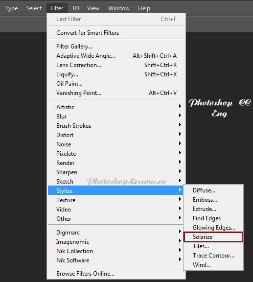 | Перевод Filter - Stylize - Solarize (Фильтр - Стилизация - Соляризация)Перевод и месторасположение Filter - Stylize - Solarize (Фильтр - Стилизация - Соляризация) на примере Photoshop CC (Eng/Rus). На изображениях ниже вы можете наглядно увидеть месторасположение и перевод термина Filter - Stylize - Solarize (Фильтр - Стилизация - Соляризация) на примере Английской и Русской версии Photoshop CC (2014). ![]() ![]() |
