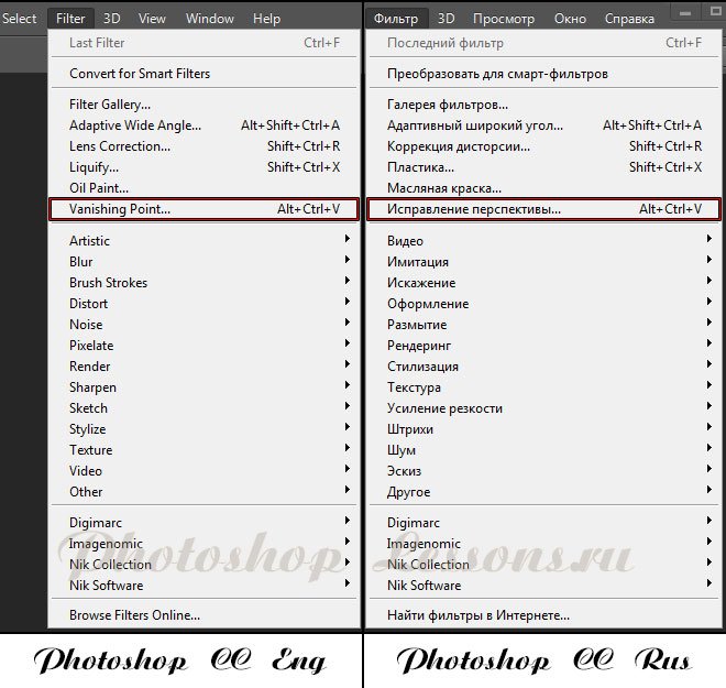 | Перевод Filter - Vanishing Point (Фильтр - Исправление перспективы / Alt+Ctrl+V)Перевод и месторасположение Filter - Vanishing Point (Фильтр - Исправление перспективы / Alt+Ctrl+V) на примере Photoshop CC (Eng/Rus). Ссылка на урок по фильтру Vanishing Point (Исправление перспективы). На изображении ниже вы можете наглядно увидеть месторасположение и перевод термина Filter - Vanishing Point (Фильтр - Исправление перспективы / Сочетание клавиш «Alt+Ctrl+V») на примере Английской и Русской версии Photoshop CC. ![]() |