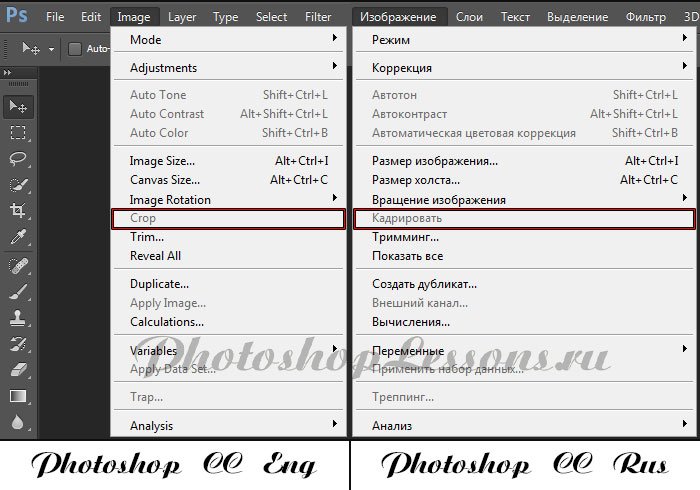 | Перевод Image - Crop (Изображение - Кадрировать)Перевод и месторасположение Image - Crop (Изображение - Кадрировать) на примере Photoshop CC (Eng/Rus). На изображении ниже вы можете наглядно увидеть месторасположение и перевод термина Image - Crop (Изображение - Кадрировать) на примере Английской и Русской версии Photoshop CC (2014). ![]() |