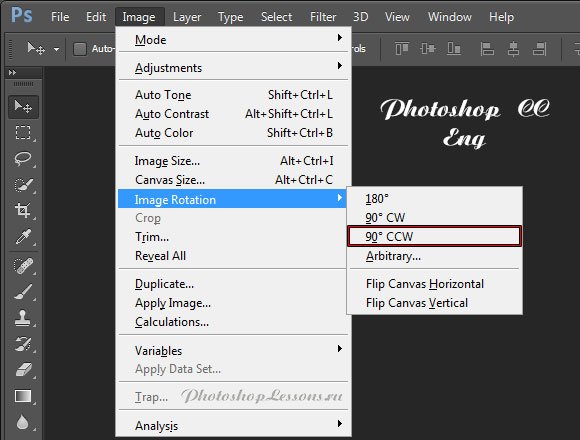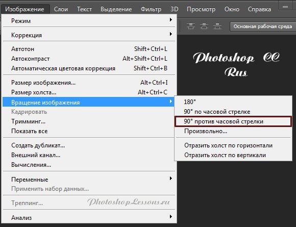 | Image - Image Rotation - 90° CCW (Изображение - Вращение изображения - 90° против часовой стрелки)Перевод Image - Image Rotation - 90° CCW (Изображение - Вращение изображения - 90° против часовой стрелки) на примере Photoshop CC (Eng/Rus). На изображениях ниже вы можете наглядно увидеть месторасположение и перевод термина Image - Image Rotation - 90° CCW (Изображение - Вращение изображения - 90° против часовой стрелки) на примере Английской и Русской версии Photoshop CC (2014). ![]() ![]() |