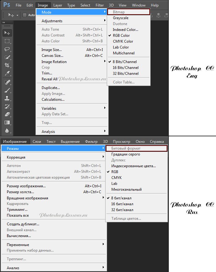 | Перевод Image - Mode - Bitmap (Изображение - Режим - Битовый формат)Перевод и месторасположение Image - Mode - Bitmap (Изображение - Режим - Битовый формат) на примере Photoshop CC (Eng/Rus). На изображении ниже вы можете наглядно увидеть месторасположение и перевод термина Image - Mode - Bitmap (Изображение - Режим - Битовый формат) на примере Английской и Русской версии Photoshop CC (2014). ![]() |