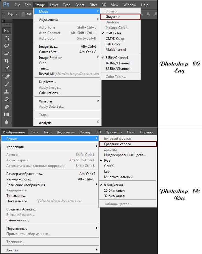 | Перевод Image - Mode - Grayscale (Изображение - Режим - Градации серого)Перевод и месторасположение Image - Mode - Grayscale (Изображение - Режим - Градации серого) на примере Photoshop CC (Eng/Rus). На изображении ниже вы можете наглядно увидеть месторасположение и перевод термина Image - Mode - Grayscale (Изображение - Режим - Градации серого) на примере Английской и Русской версии Photoshop CC (2014). ![]() |