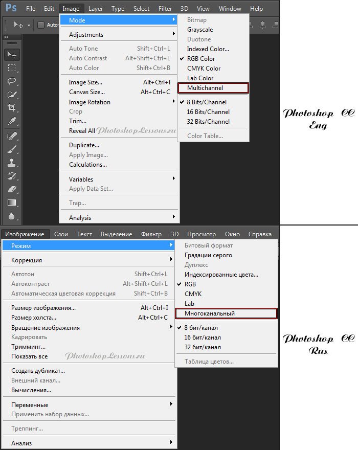 | Перевод Image - Mode - Multichannel (Изображение - Режим - Многоканальный)Перевод и месторасположение Image - Mode - Multichannel (Изображение - Режим - Многоканальный) на примере Photoshop CC (Eng/Rus). На изображении ниже вы можете наглядно увидеть месторасположение и перевод термина Image - Mode - Multichannel (Изображение - Режим - Многоканальный) на примере Английской и Русской версии Photoshop CC (2014). ![]() |