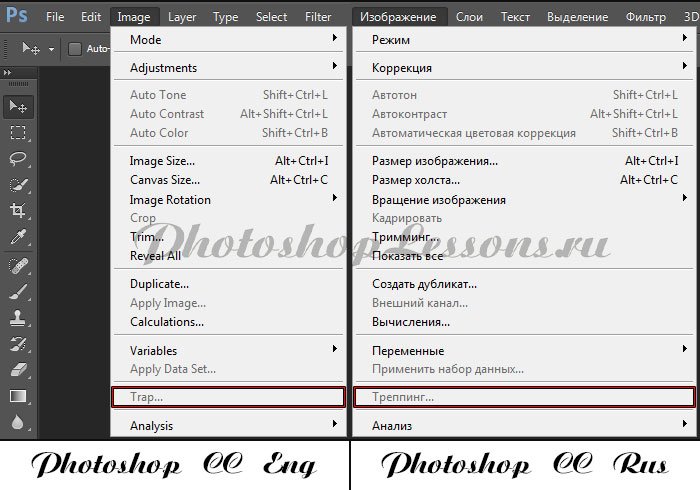 | Перевод Image - Trap (Изображение - Треппинг)Перевод и месторасположение Image - Trap (Изображение - Треппинг) на примере Photoshop CC (Eng/Rus). На изображении ниже вы можете наглядно увидеть месторасположение и перевод термина Image - Trap (Изображение - Треппинг) на примере Английской и Русской версии Photoshop CC (2014). ![]() |