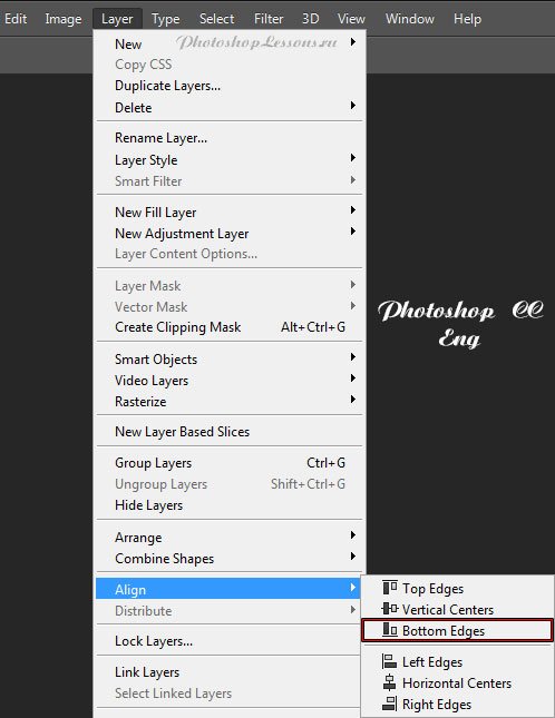 | Перевод Layer - Align - Bottom Edges (Слои - Выровнять - Нижние края)Перевод и месторасположение Layer - Align - Bottom Edges (Слои - Выровнять - Нижние края) на примере Photoshop CC (Eng/Rus). На изображениях ниже вы можете наглядно увидеть месторасположение и перевод термина Layer - Align - Bottom Edges (Слои - Выровнять - Нижние края) на примере Английской и Русской версии Photoshop CC (2014). ![]() ![]() |
