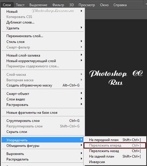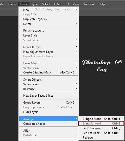 | Перевод Layer - Arrange - Bring Forward (Слои - Упорядочить - Переложить вперед / Ctrl+])Перевод и месторасположение Layer - Arrange - Bring Forward (Слои - Упорядочить - Переложить вперед) на примере Photoshop CC (Eng/Rus). На изображениях ниже вы можете наглядно увидеть месторасположение и перевод термина Layer - Arrange - Bring Forward (Слои - Упорядочить - Переложить вперед / Сочетание клавиш «Ctrl+]») на примере Английской и Русской версии Photoshop CC (2014). ![]() ![]() |