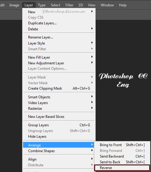 | Перевод Layer - Arrange - Reverse (Слои - Упорядочить - Инверсия)Перевод и месторасположение Layer - Arrange - Reverse (Слои - Упорядочить - Инверсия) на примере Photoshop CC (Eng/Rus). На изображениях ниже вы можете наглядно увидеть месторасположение и перевод термина Layer - Arrange - Reverse (Слои - Упорядочить - Инверсия) на примере Английской и Русской версии Photoshop CC (2014). ![]() ![]() |