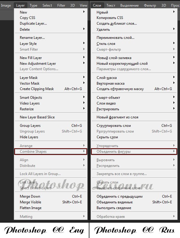 | Перевод Layer - Combine Shapes (Слои - Объединить фигуры)Перевод и месторасположение Layer - Combine Shapes (Слои - Объединить фигуры) на примере Photoshop CC (Eng/Rus). На изображении ниже вы можете наглядно увидеть месторасположение и перевод термина Layer - Combine Shapes (Слои - Объединить фигуры) на примере Английской и Русской версии Photoshop CC (2014). ![]() |