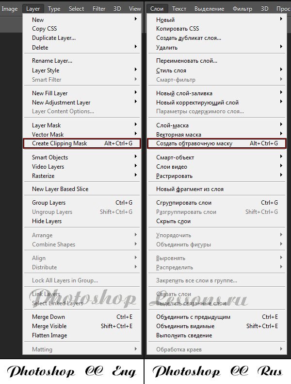 | Перевод Layer - Create Clipping Mask (Слои - Создать обтравочную маску / Alt+Ctrl+G)Перевод и месторасположение Layer - Create Clipping Mask (Слои - Слои - Создать обтравочную маску) на примере Photoshop CC (Eng/Rus). На изображении ниже вы можете наглядно увидеть месторасположение и перевод термина Layer - Create Clipping Mask (Слои - Создать обтравочную маску / Сочетание клавиш «Alt+Ctrl+G») на примере Английской и Русской версии Photoshop CC (2014). ![]() |
