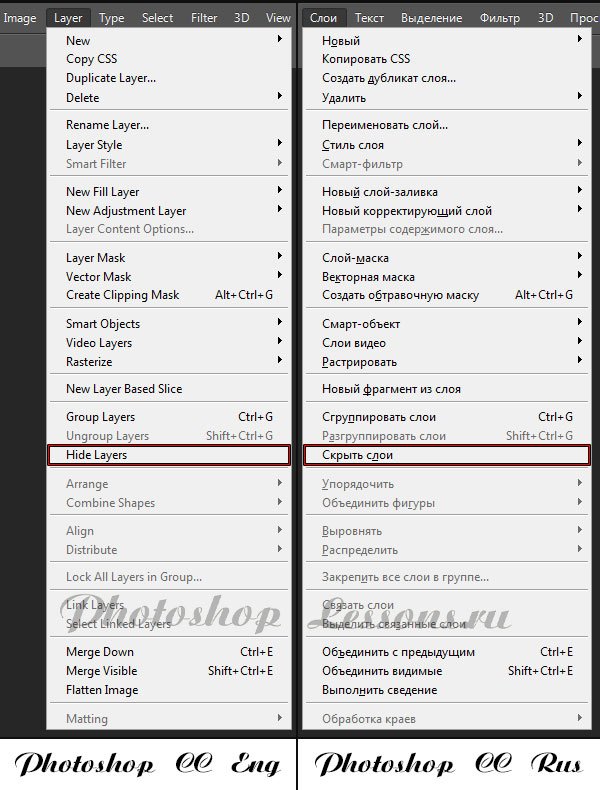 | Перевод Layer - Hide Layers (Слои - Скрыть слои)Перевод и месторасположение Layer - Hide Layers (Слои - Скрыть слои) на примере Photoshop CC (Eng/Rus). На изображении ниже вы можете наглядно увидеть месторасположение и перевод термина Layer - Hide Layers (Слои - Скрыть слои) на примере Английской и Русской версии Photoshop CC (2014). ![]() |