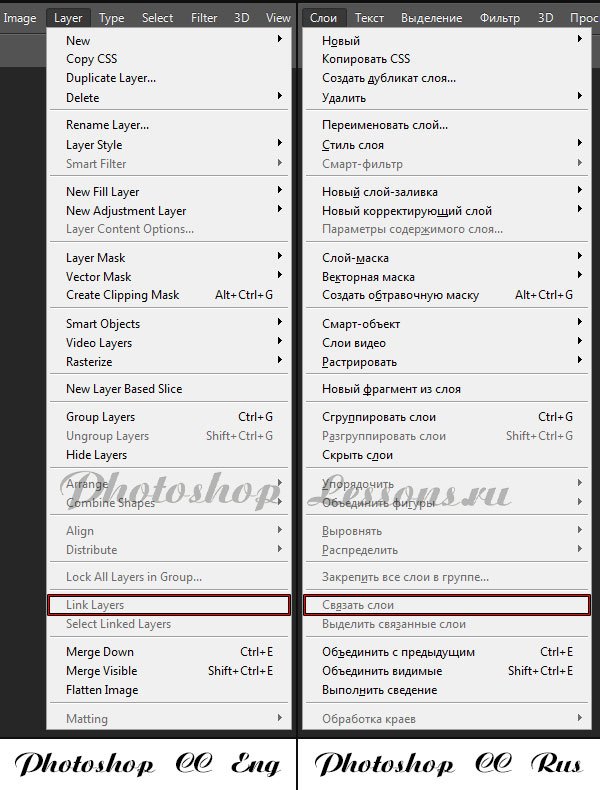 | Перевод Layer - Link Layers (Слои - Связать слои)Перевод и месторасположение Layer - Link Layers (Слои - Связать слои) на примере Photoshop CC (Eng/Rus). На изображении ниже вы можете наглядно увидеть месторасположение и перевод термина Layer - Link Layers (Слои - Связать слои) на примере Английской и Русской версии Photoshop CC (2014). ![]() |