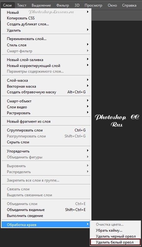 | Перевод Layer - Matting - Remove White Matte (Слои - Обработка краев - Удалить белый ореол)Перевод и месторасположение Layer - Matting - Remove White Matte (Слои - Обработка краев - Удалить белый ореол) на примере Photoshop CC (Eng/Rus). На изображениях ниже вы можете наглядно увидеть месторасположение и перевод термина Layer - Matting - Remove White Matte (Слои - Обработка краев - Удалить белый ореол) на примере Английской и Русской версии Photoshop CC (2014). ![]() ![]() |
