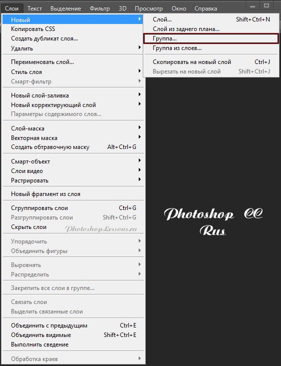 | Перевод Layer - New - Group (Слои - Новый - Группа)Перевод и месторасположение Layer - New - Group (Слои - Новый - Группа) на примере Photoshop CC (Eng/Rus). На изображениях ниже вы можете наглядно увидеть месторасположение и перевод термина Layer - New - Group (Слои - Новый - Группа) на примере Английской и Русской версии Photoshop CC (2014). ![]() ![]() |