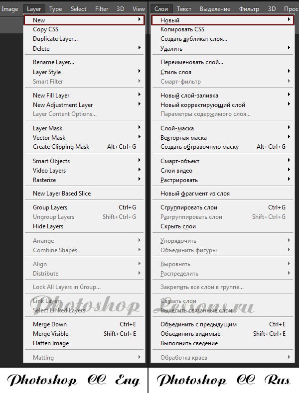 | Перевод Layer - New (Слои - Новый)Перевод и месторасположение Layer - New (Слои - Новый) на примере Photoshop CC (Eng/Rus). На изображении ниже вы можете наглядно увидеть месторасположение и перевод термина Layer - New (Слои - Новый) на примере Английской и Русской версии Photoshop CC (2014). ![]() |