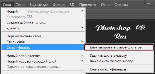| Layer - Smart Filter - Disable Smart Filters (Слои - Смарт-фильтр - Деактивировать смарт-фильтры)Перевод Layer - Smart Filter - Disable Smart Filters (Слои - Смарт-фильтр - Деактивировать смарт-фильтры) на примере Photoshop CC (Eng/Rus). На изображениях ниже вы можете наглядно увидеть месторасположение и перевод термина Layer - Smart Filter - Disable Smart Filters (Слои - Смарт-фильтр - Деактивировать смарт-фильтры) на примере Английской и Русской версии Photoshop CC (2014). ![]() ![]() |