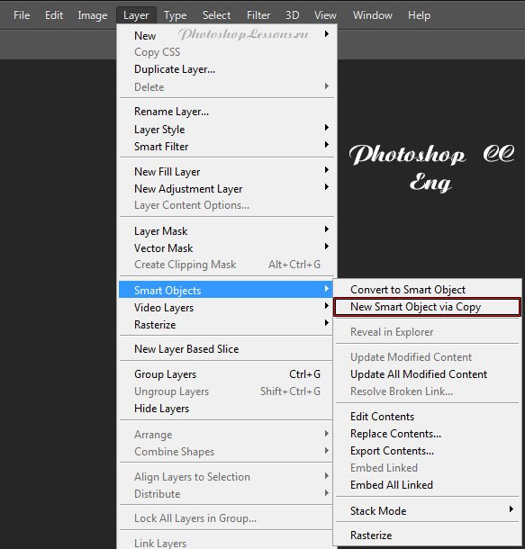 | Layer - Smart Objects - New Smart Object via Copy (Слои - Смарт-объект - Создать смарт-объект путем копирования)Перевод и месторасположение Layer - Smart Objects - New Smart Object via Copy (Слои - Смарт-объект - Создать смарт-объект путем копирования) на примере Photoshop CC (Eng/Rus). На изображениях ниже вы можете наглядно увидеть месторасположение и перевод термина Layer - Smart Objects - New Smart Object via Copy (Слои - Смарт-объект - Создать смарт-объект путем копирования) на примере Английской и Русской версии Photoshop CC (2014). ![]() ![]() |