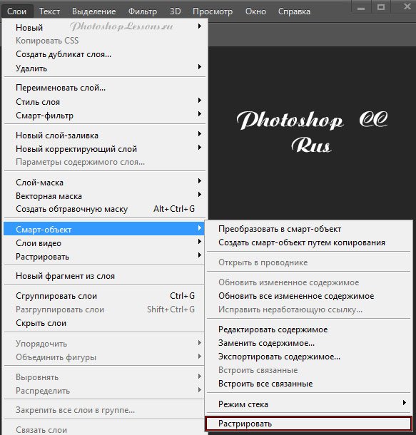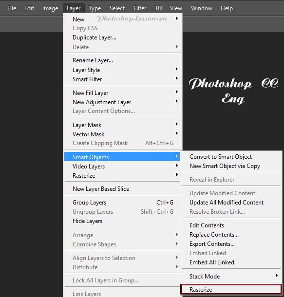 | Перевод Layer - Smart Objects - Rasterize (Слои - Смарт-объект - Растрировать)Перевод и месторасположение Layer - Smart Objects - Rasterize (Слои - Смарт-объект - Растрировать) на примере Photoshop CC (Eng/Rus). На изображениях ниже вы можете наглядно увидеть месторасположение и перевод термина Layer - Smart Objects - Rasterize (Слои - Смарт-объект - Растрировать) на примере Английской и Русской версии Photoshop CC (2014). ![]() ![]() |