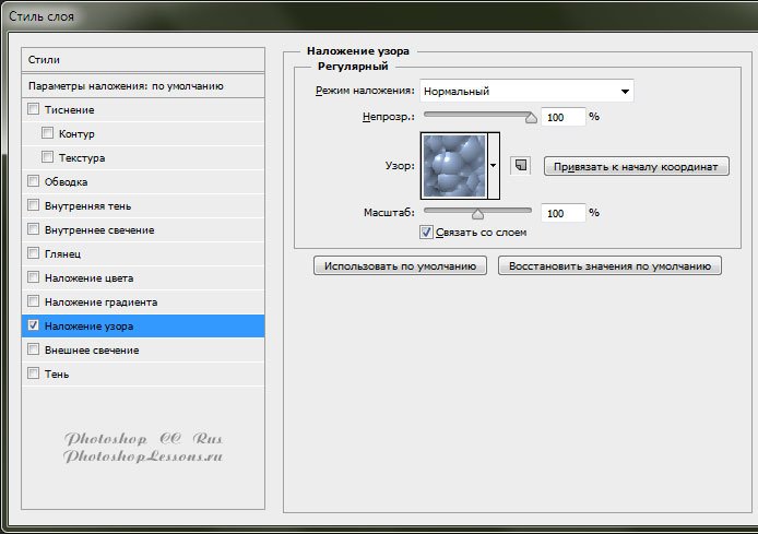 | Перевод Layer Style - Pattern Overlay (Стиль слоя - Наложение узора)Перевод и месторасположение Layer Style - Pattern Overlay (Стиль слоя - Наложение узора) на примере Photoshop CC (Eng/Rus). Узнать как перейти в Blending Option (Параметры наложения / Окно «Стиль слоя» (Layer Style)) можно в материале по ссылке - «Как перейти в Blending Option (Параметры наложения) в Фотошопе». Перейти в Layer Style - Pattern Overlay (Стиль слоя - Наложения узора) можно так же из верхнего меню: Layer - Layer Style - Pattern Overlay (Слои - Стиль слоя - Наложения узора); На изображениях ниже вы можете наглядно увидеть месторасположение и перевод Layer Style - Pattern Overlay (Стиль слоя - Наложение узора) на примере Английской и Русской версии Photoshop CC (2014). ![]() ![]() Варианты Pattern Overlay - Blend Mode (Наложение узора - Режим наложения)Normal - Нормальный; Dissolve - Затухание; Darken - Затемнение; Multiply - Умножение; Color Burn - Затемнение основы; Linear Burn - Линейный затемнитель; Darker Color - Темнее; Lighten - Замена светлым; Screen - Экран; Color Dodge - Осветление основы; Color Dodge (Add) - Линейный осветлитель (добавить); Lighter Color - Светлее; Overlay - Перекрытие; Soft Light - Мягкий свет; Hard Light - Жесткий свет; Vivid Light - Яркий свет; Linear Light - Линейный свет; Pin Light - Точечный свет; Hard Mix - Жесткое смешение; Difference - Разница; Exclusion - Исключение; Subtract - Вычитание; Divide - Разделить; Hue - Цветовой тон; Saturation - Насыщенность; Color - Цветность; Luminosity - Яркость; ![]() ![]() Стиль слоя - Наложение узора - ЭлементыOpacity - Непрозрачность; Pattern - Узор; Snap to Origin - Привязать к началу координат; Scale - Масштаб; Link with Layer - Связать со слоем; |