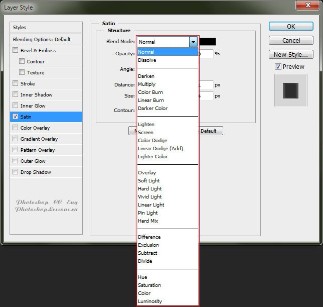 | Перевод Layer Style - Satin (Стиль слоя - Глянец)Перевод и месторасположение Layer Style - Satin (Стиль слоя - Глянец) на примере Photoshop CC (Eng/Rus). Узнать как перейти в Blending Option (Параметры наложения / Окно «Стиль слоя» (Layer Style)) можно в материале по ссылке - «Как перейти в Blending Option (Параметры наложения) в Фотошопе». Перейти в Layer Style - Satin (Стиль слоя - Глянец) можно так же из верхнего меню: Layer - Layer Style - Satin (Слои - Стиль слоя - Глянец); На изображениях ниже вы можете наглядно увидеть месторасположение и перевод Layer Style - Satin (Стиль слоя - Глянец) на примере Английской и Русской версии Photoshop CC (2014). ![]() ![]() Варианты Satin - Blend Mode (Глянец - Режим наложения)Normal - Нормальный; Dissolve - Затухание; Darken - Затемнение; Multiply - Умножение; Color Burn - Затемнение основы; Linear Burn - Линейный затемнитель; Darker Color - Темнее; Lighten - Замена светлым; Screen - Экран; Color Dodge - Осветление основы; Color Dodge (Add) - Линейный осветлитель (добавить); Lighter Color - Светлее; Overlay - Перекрытие; Soft Light - Мягкий свет; Hard Light - Жесткий свет; Vivid Light - Яркий свет; Linear Light - Линейный свет; Pin Light - Точечный свет; Hard Mix - Жесткое смешение; Difference - Разница; Exclusion - Исключение; Subtract - Вычитание; Divide - Разделить; Hue - Цветовой тон; Saturation - Насыщенность; Color - Цветность; Luminosity - Яркость; ![]() ![]() Стиль слоя - Глянец - ЭлементыOpacity - Непрозрачность; Angle - Угол; Distance - Смещение; Size - Размер; Contour - Контур; Anti-aliased - Сглаживание; Invert - Инвертировать; |
