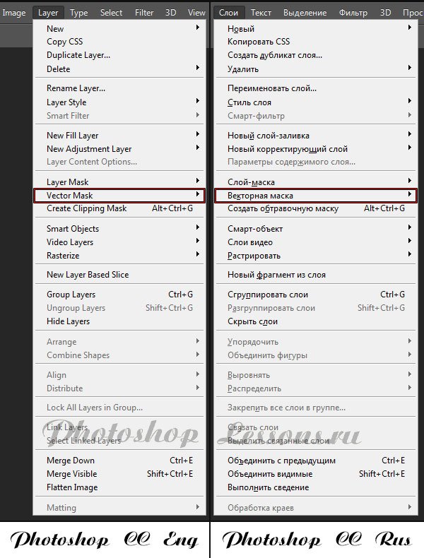 | Перевод Layer - Vector Mask (Слои - Векторная маска)Перевод и месторасположение Layer - Vector Mask (Слои - Векторная маска) на примере Photoshop CC (Eng/Rus). На изображении ниже вы можете наглядно увидеть месторасположение и перевод термина Layer - Vector Mask (Слои - Векторная маска) на примере Английской и Русской версии Photoshop CC (2014). ![]() |