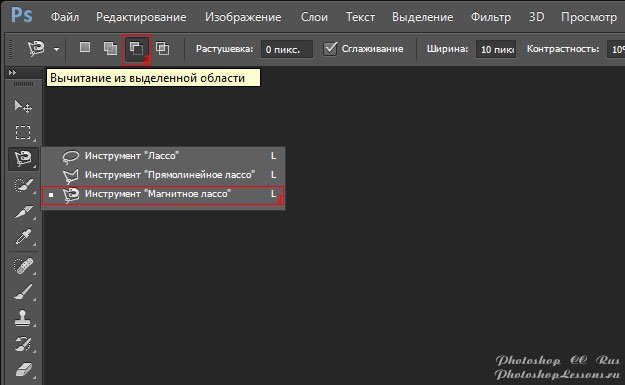 | Magnetic Lasso Tool - Subtract from selection (Инструмент «Магнитное лассо» - Вычитание из выделенной области)Перевод и месторасположение Magnetic Lasso Tool - Subtract from selection (Инструмент «Магнитное лассо» - Вычитание из выделенной области) на примере Photoshop CC (Eng/Rus). На изображениях ниже вы можете наглядно увидеть месторасположение и перевод Magnetic Lasso Tool - Subtract from selection (Инструмент «Магнитное лассо» - Вычитание из выделенной области) на примере Английской и Русской версии Photoshop CC (2014). ![]() ![]() |