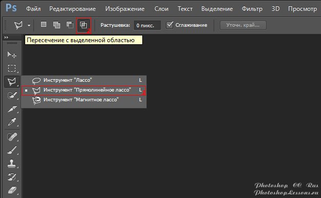 | Polygonal Lasso Tool - Intersect with selection (Инструмент «Прямолинейное лассо» - Пересечение с выделенной обл.)Перевод и месторасположение Polygonal Lasso Tool - Intersect with selection (Инструмент «Прямолинейное лассо» - Пересечение с выделенной областью) на примере Photoshop CC (Eng/Rus). На изображениях ниже вы можете наглядно увидеть месторасположение и перевод Polygonal Lasso Tool - Intersect with selection (Инструмент «Прямолинейное лассо» - Пересечение с выделенной областью) на примере Английской и Русской версии Photoshop CC (2014). ![]() ![]() |