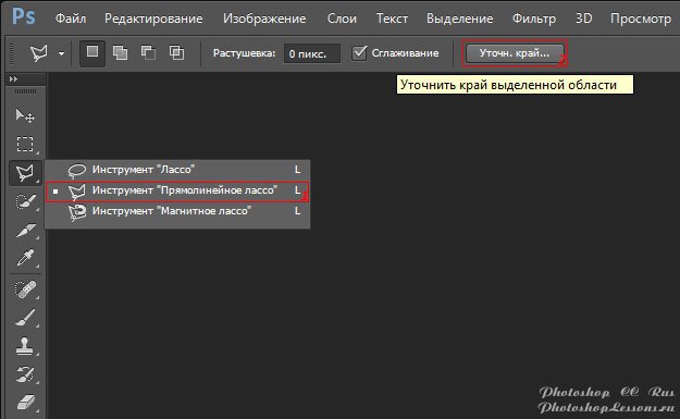 | Перевод Polygonal Lasso Tool - Refine Edge (Инструмент «Прямолинейное лассо» - Уточн. край)Перевод и месторасположение Polygonal Lasso Tool - Refine Edge (Инструмент «Прямолинейное лассо» - Уточн. край) на примере Photoshop CC (Eng/Rus). На изображениях ниже вы можете наглядно увидеть месторасположение и перевод Polygonal Lasso Tool - Refine Edge (Инструмент «Прямолинейное лассо» - Уточн. край) на примере Английской и Русской версии Photoshop CC (2014). ![]() ![]() |