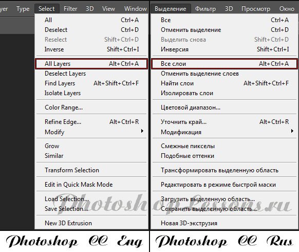 | Перевод Select - All Layers (Выделение - Все слои / Alt+Ctrl+A)Перевод и месторасположение Select - All Layers (Выделение - Все слои / Alt+Ctrl+A) на примере Photoshop CC (Eng/Rus). На изображении ниже вы можете наглядно увидеть месторасположение и перевод термина Select - All Layers (Выделение - Все слои / Сочетание клавиш «Alt+Ctrl+A») на примере Английской и Русской версии Photoshop CC (2014). ![]() |
