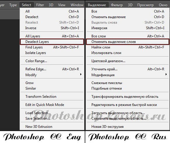 | Перевод Select - Deselect Layers (Выделение - Отменить выделение слоев)Перевод и месторасположение Select - Deselect Layers (Выделение - Отменить выделение слоев) на примере Photoshop CC (Eng/Rus). На изображении ниже вы можете наглядно увидеть месторасположение и перевод термина Select - Deselect Layers (Выделение - Отменить выделение слоев) на примере Английской и Русской версии Photoshop CC (2014). ![]() |
