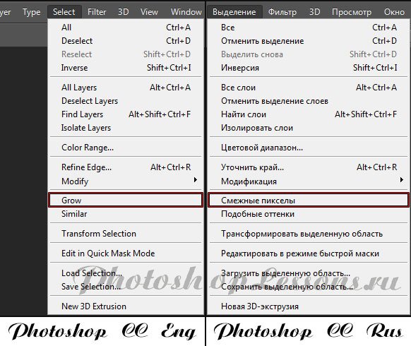 | Перевод Select - Grow (Выделение - Смежные пикселы)Перевод и месторасположение Select - Grow (Выделение - Смежные пикселы) на примере Photoshop CC (Eng/Rus). На изображении ниже вы можете наглядно увидеть месторасположение и перевод термина Select - Grow (Выделение - Смежные пикселы) на примере Английской и Русской версии Photoshop CC (2014). ![]() |